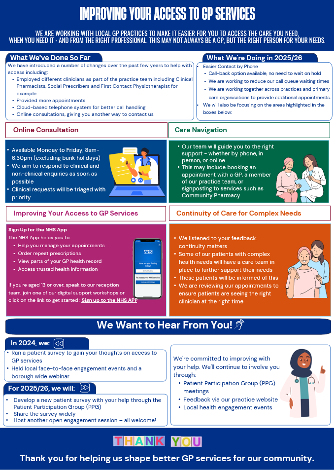 We work together to share best practice and develop new services for the benefit of all patients regardless of your registered practice. Each practice still maintains their autonomy in providing care for their registered patients and they all have access to the services provided by the PCN.